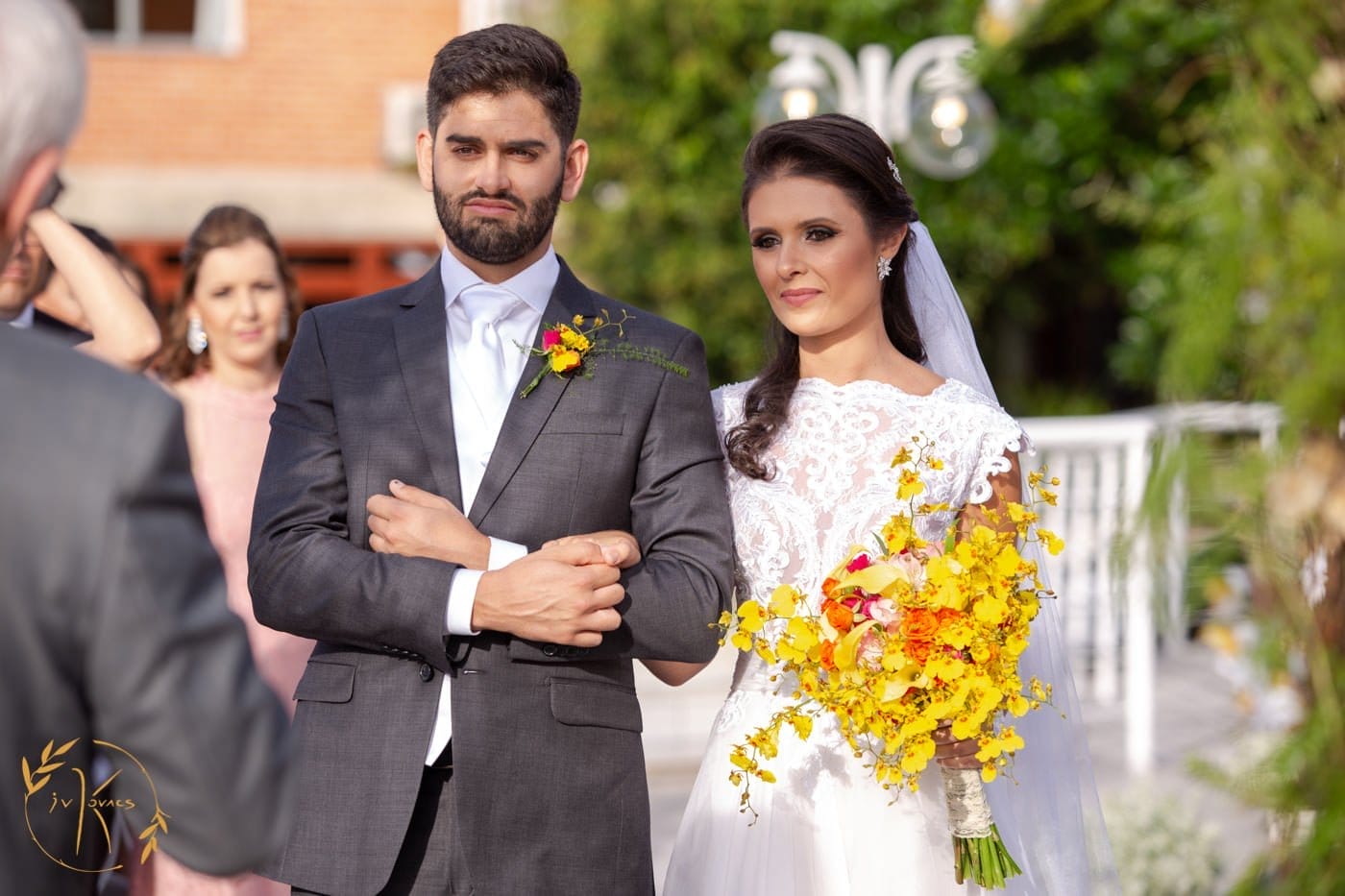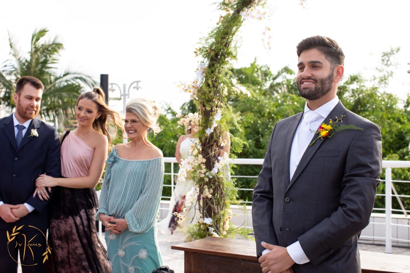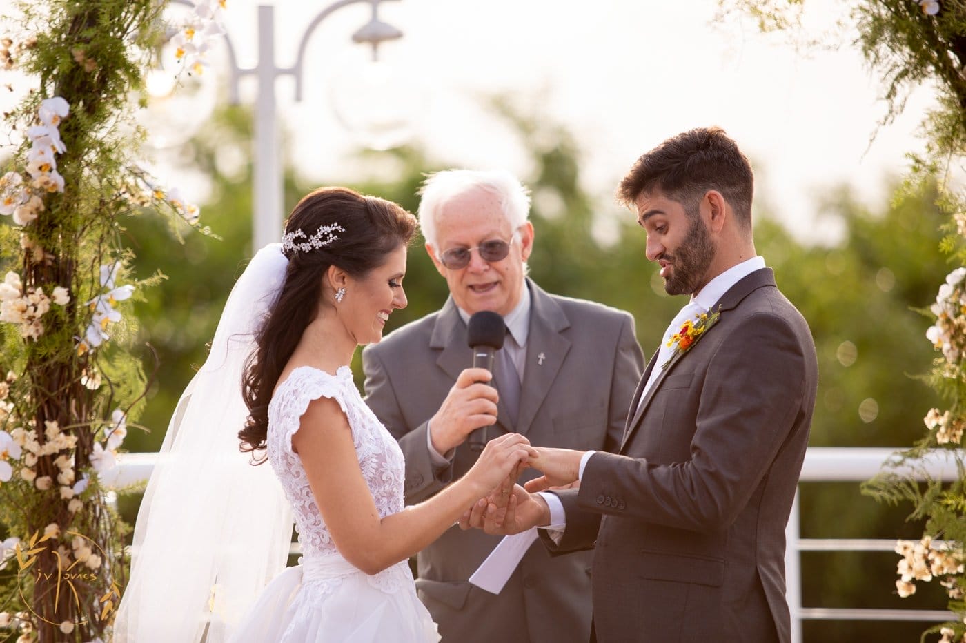 A cerimônia foi marcada por uma brisa suave que acrescentava movimento ao véu da noiva enquanto ela caminhava ao encontro de Gabriel. A natureza parecia conspirar para tornar o momento ainda mais mágico, com o mar ao fundo e o pôr do sol tingindo o céu de cores quentes.