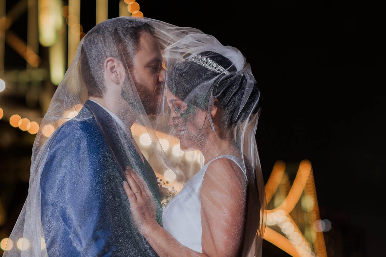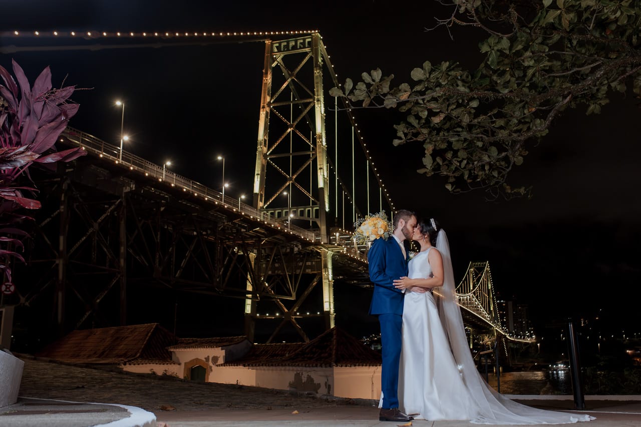 Após a cerimônia, o casal aproveitou sob o cair da noite para registrar momentos únicos no Forte Sant’Ana, com a deslumbrante vista da Ponte Hercílio Luz iluminada. Cada foto expressa emoção e leveza, valorizando uma atmosfera atemporal da celebração.