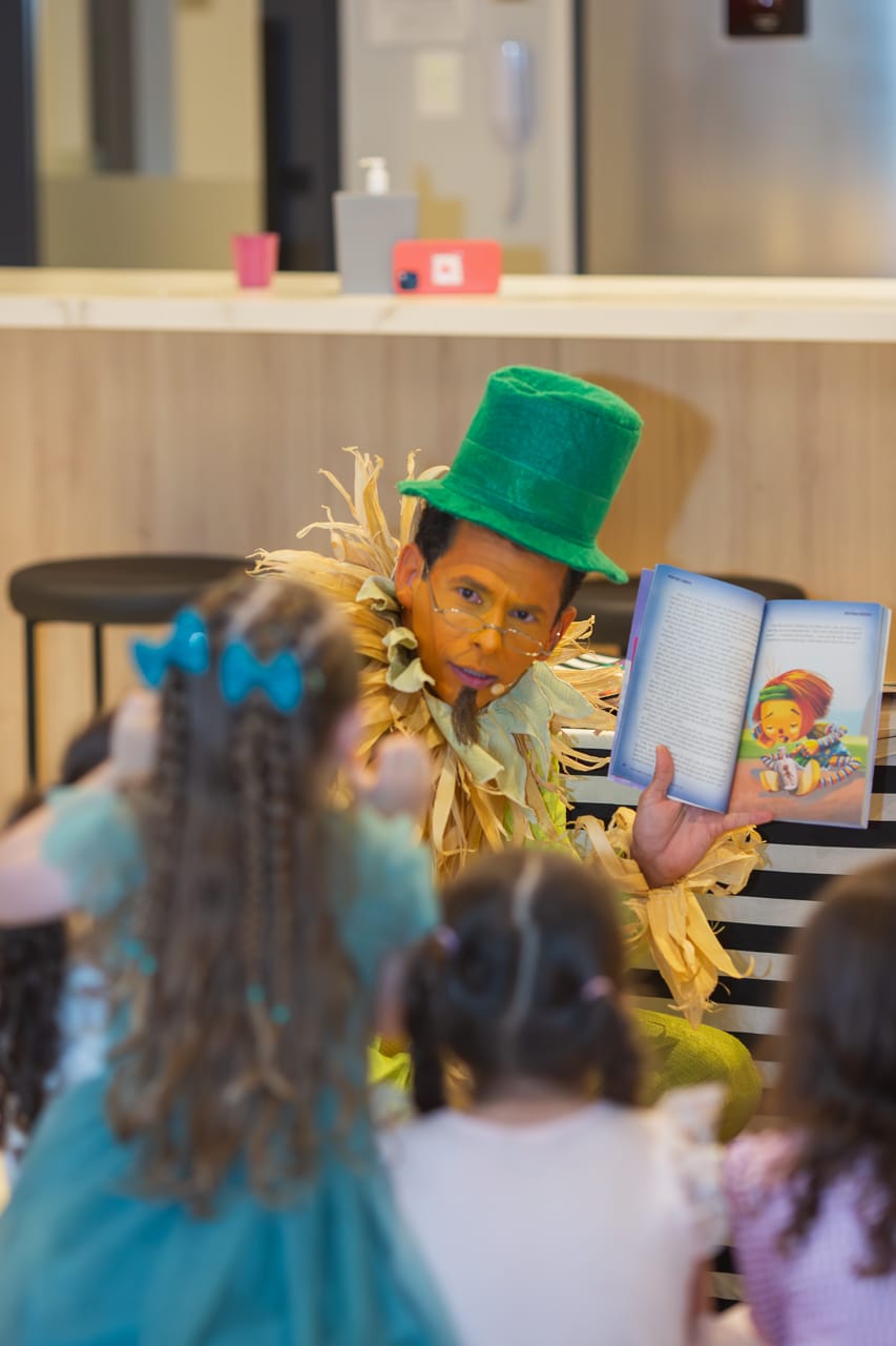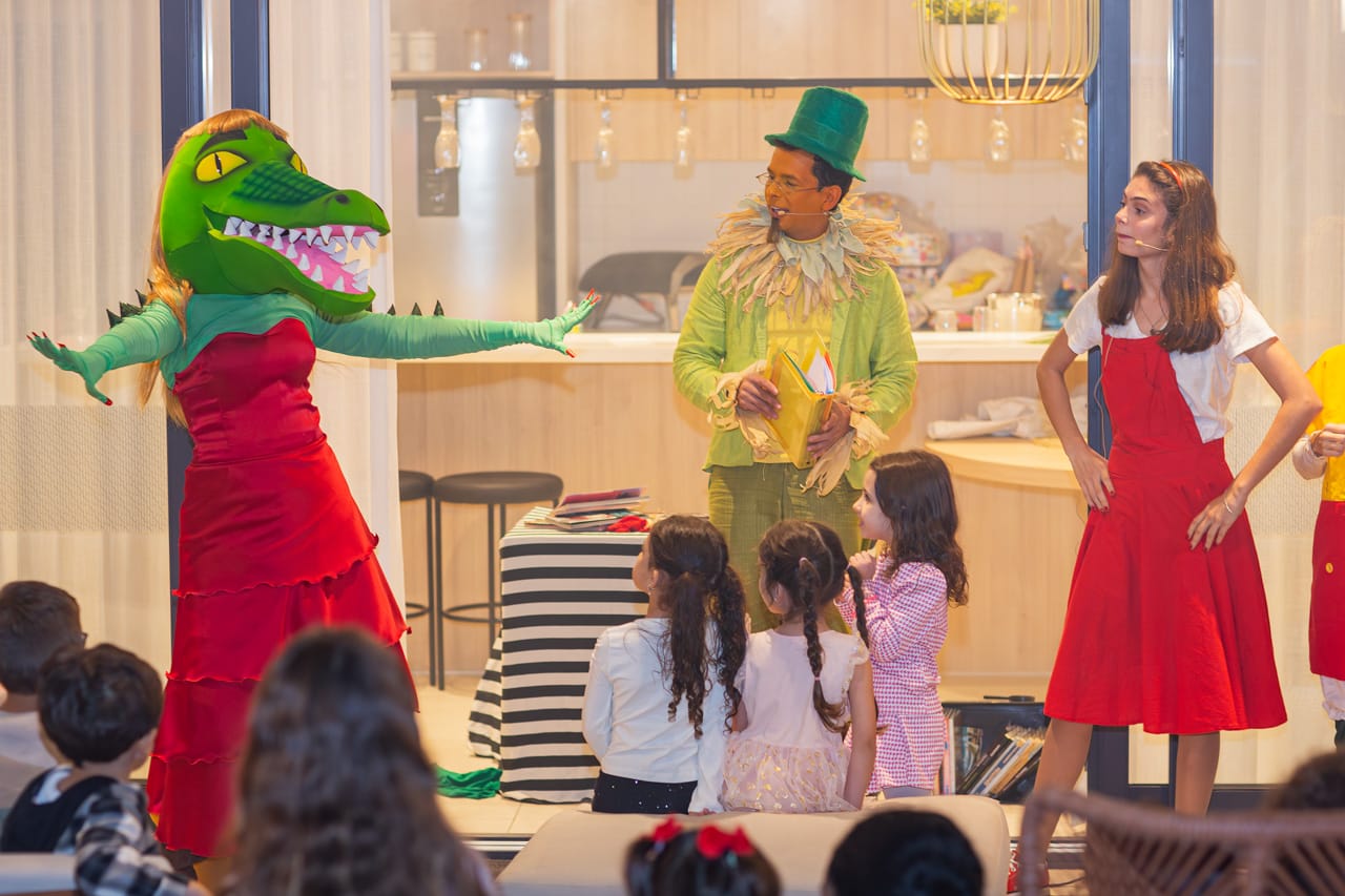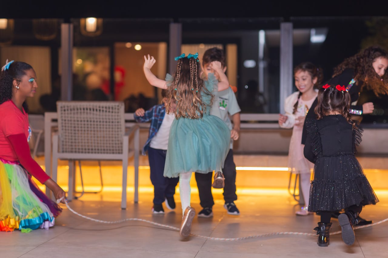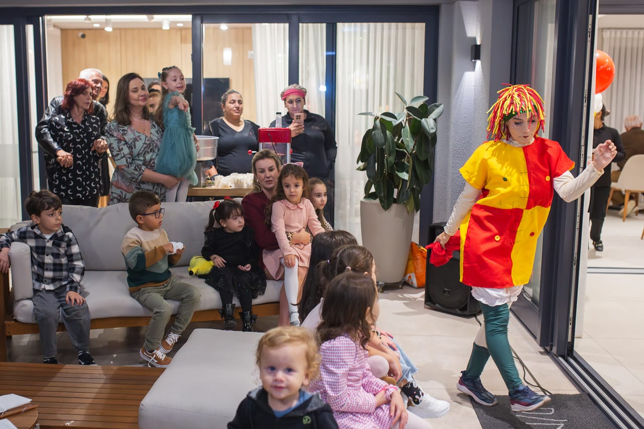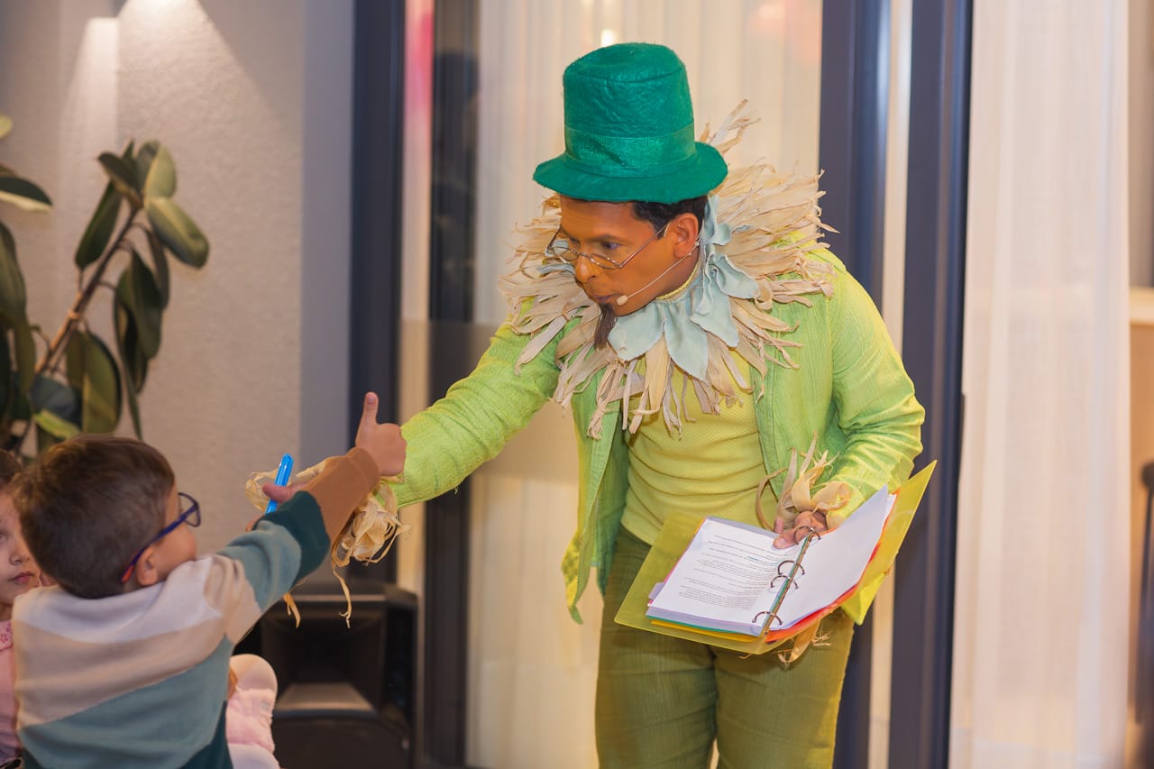 Um dos momentos mais marcantes da noite foi, sem dúvida, a apresentação teatral com a turma do Sítio do Picapau Amarelo. De repente, todos os personagens estavam ali, bem na frente da criançada, transformando o salão em um verdadeiro palco. Foi fascinante presenciar a interação genuína das crianças com a história, vendo seus rostinhos passarem por um misto de emoções: o suspense, o humor que arrancava gargalhadas e um interesse profundo nos personagens ali presentes. Capturar os olhares vidrados da Theodora e de seus amigos durante a peça foi registrar a magia em sua forma mais pura.