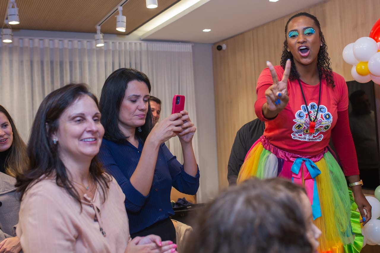 Para ajudar a canalizar toda essa energia, a equipe do Circo do Riso entrou em cena. As meninas foram as parceiras perfeitas para a Theodora, propondo brincadeiras, interagindo com a criançada e garantindo que a diversão não tivesse fim. Nosso trabalho, portanto, foi ficar de prontidão para não perder um único instante dessa interação genuína.
